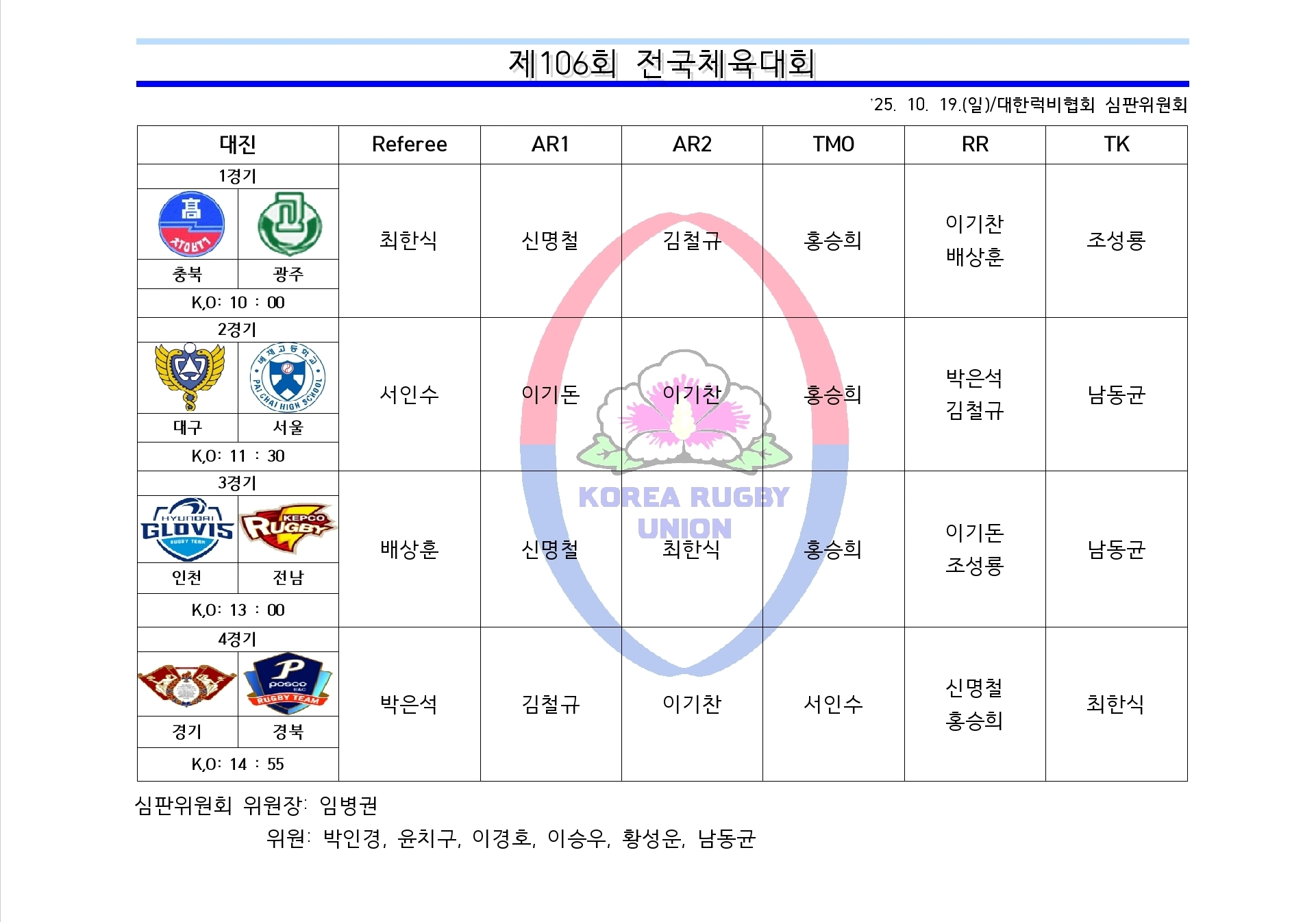 제106회 전국체육대회 심판 배정(10.20.)