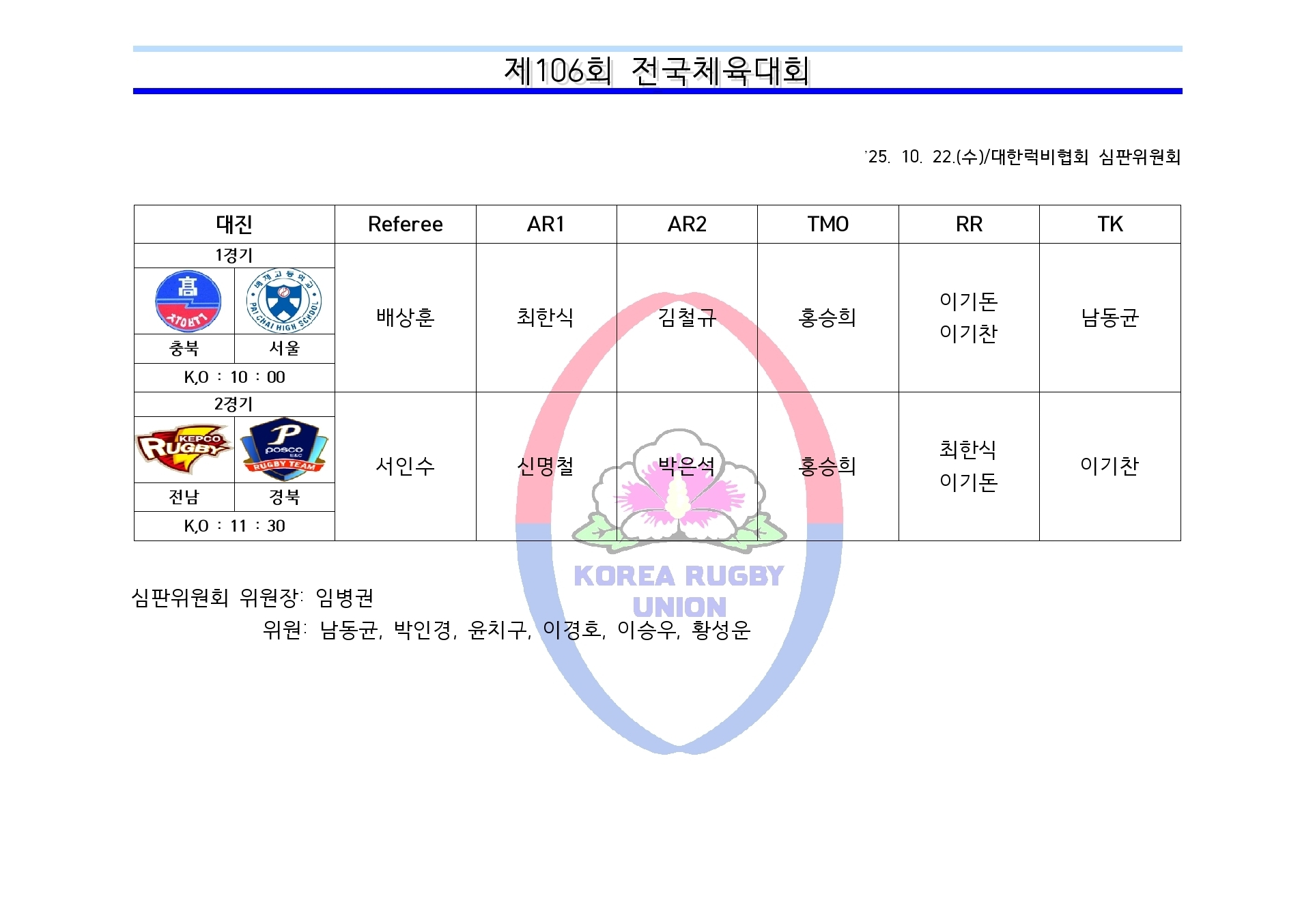제106회 전국체육대회 심판 배정(10.23.)