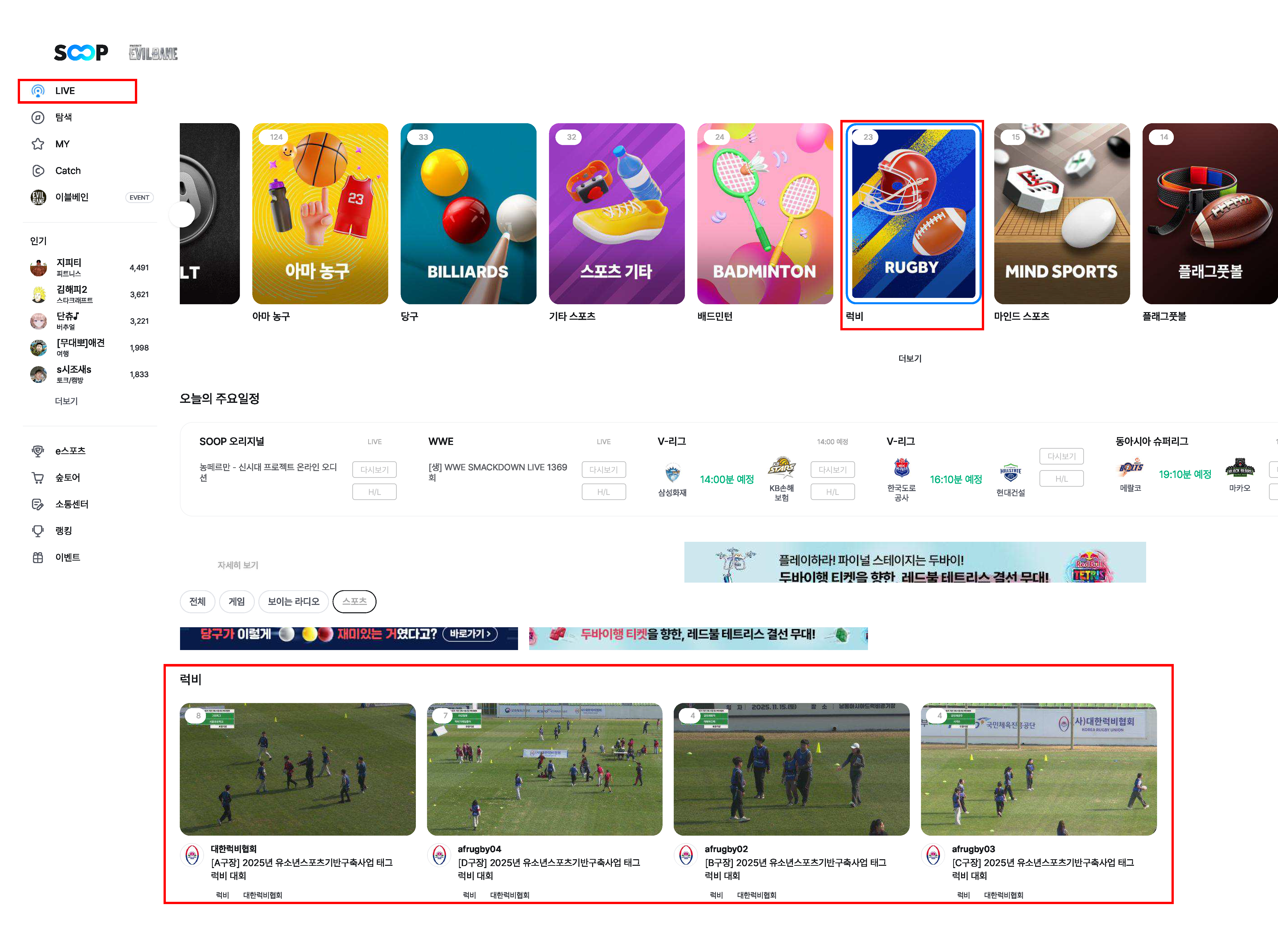2025년도 유소년스포츠기반 구축 사업 태그럭비 중계 안내 2025.11.15 - A구장: 대한럭비협회 - SOOP - B구장: afrugby02 - SOOP - C구장: afrugby03 - SOOP - D구장 afrugby04 - SOOP
