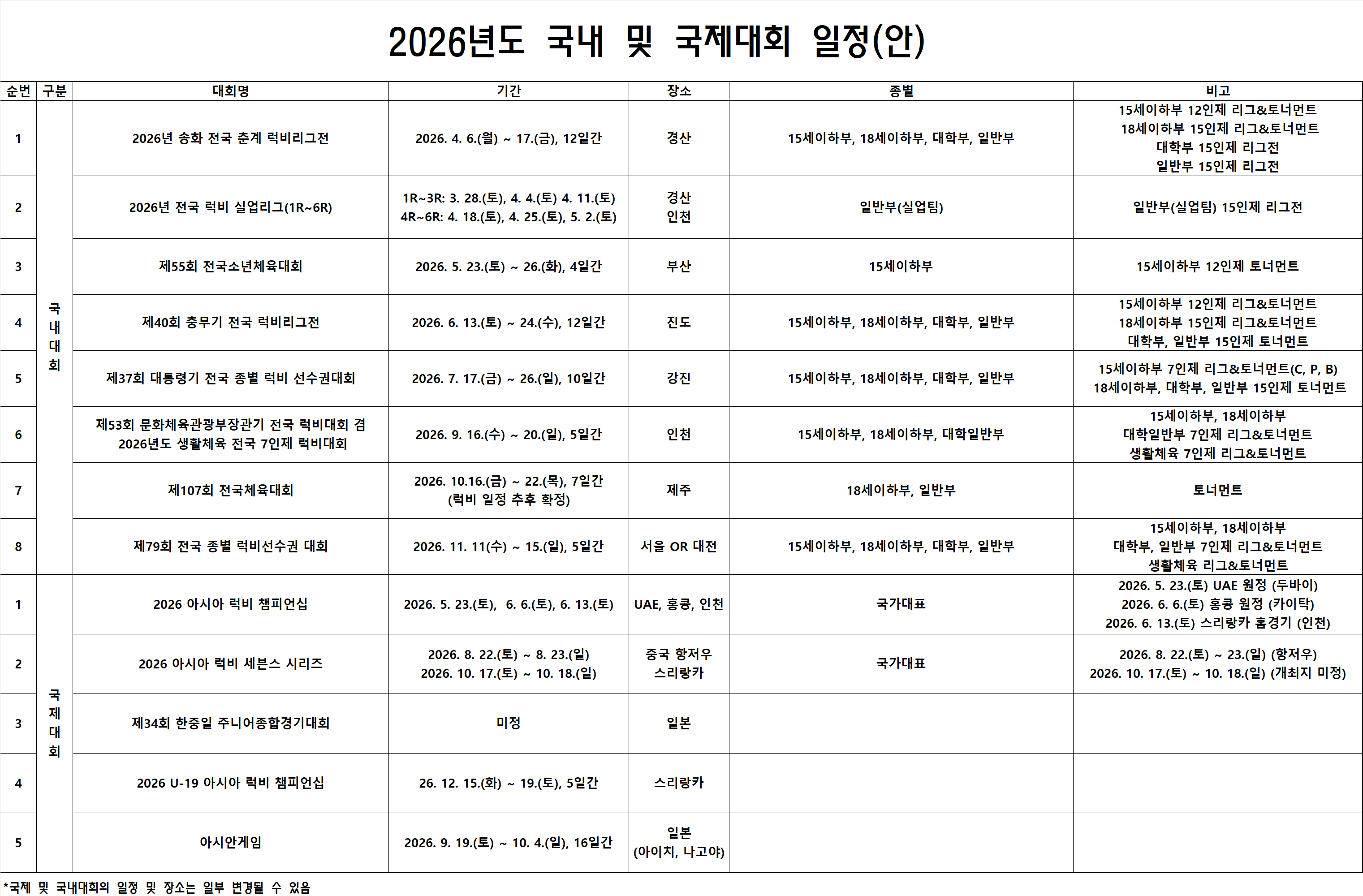 2026년도 국제 및 국내대회 일정