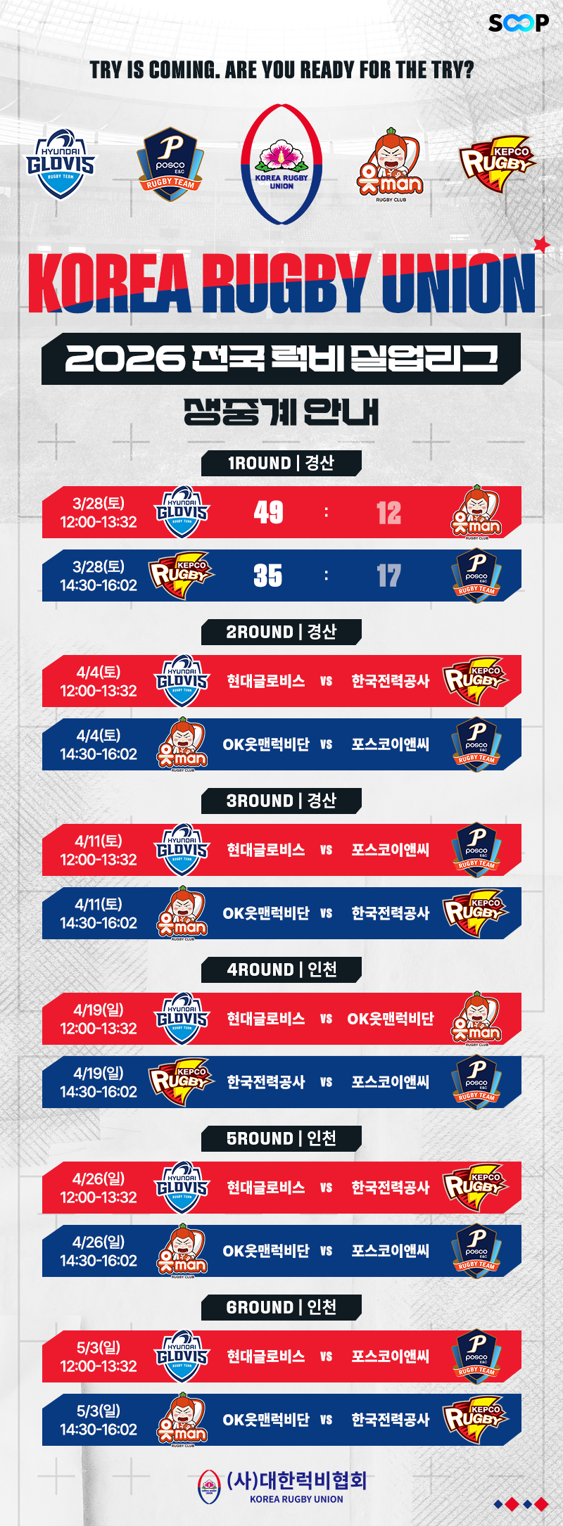 2026 전국 럭비 실업리그 중계 안내 2026.04.04 2026 전국 럭비 리그전은 대한럭비협회 SOOP에서 실시간으로 시청하실 수 있습니다. ▷ 중계링크 : 대한럭비협회 | SOOP 플레이어