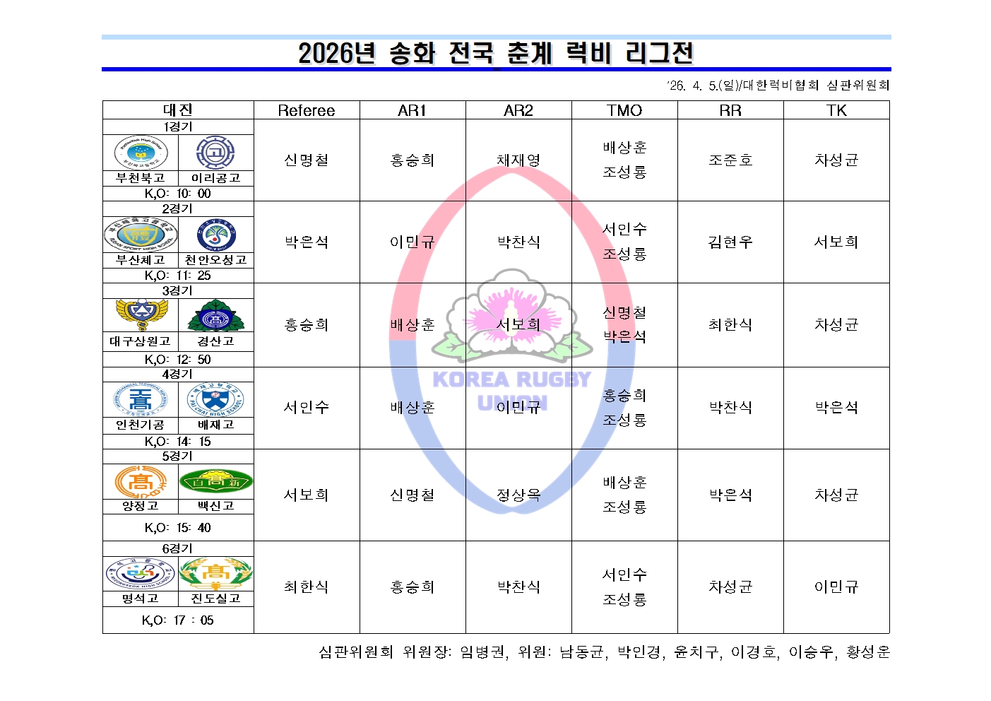 2026년 송화 전국 춘계 럭비 리그전(04.06) 심판 배정