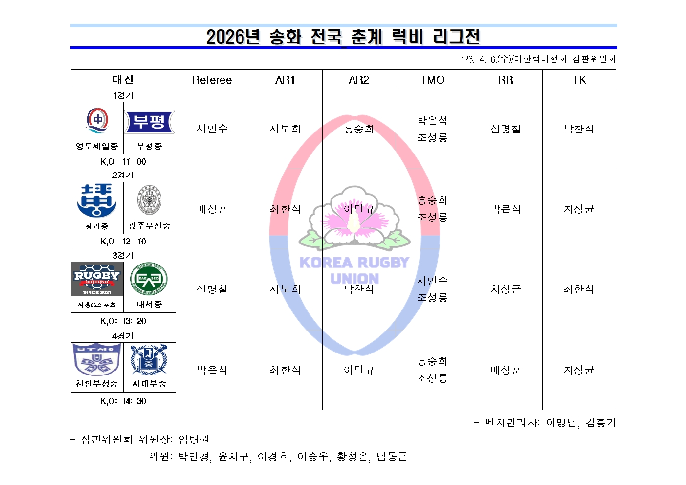 2026년 송화 전국 춘계 럭비 리그전(04.08) 심판 배정
