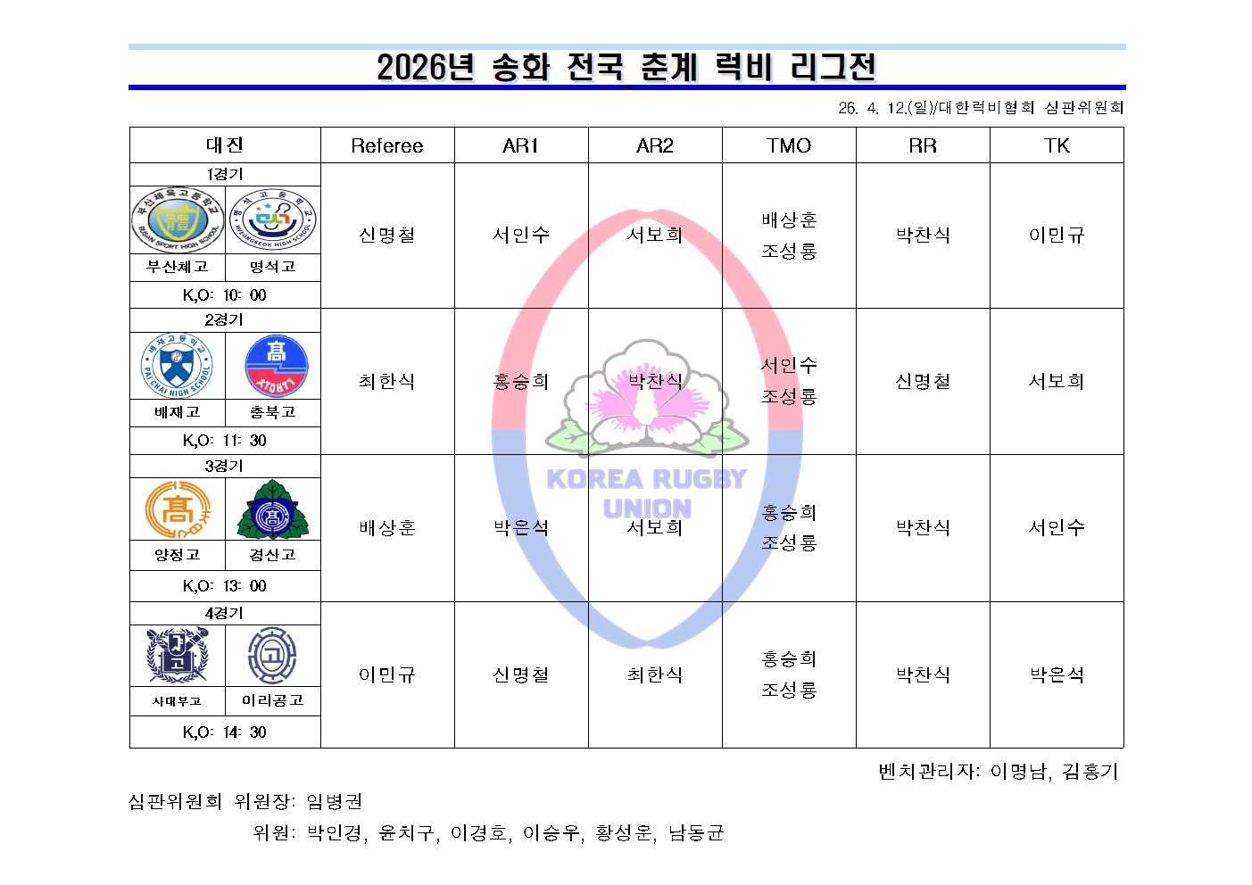 2026년 송화 전국 춘계 럭비 리그전(04.13) 심판 배정