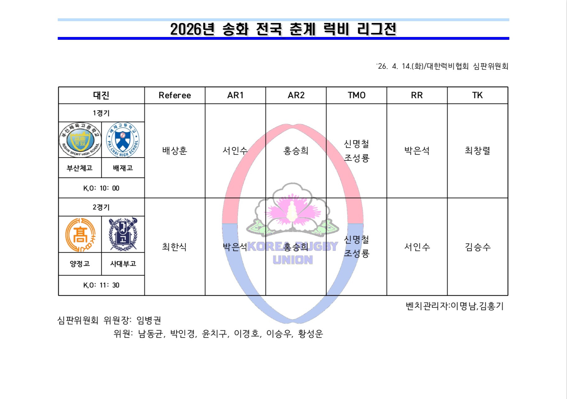 2026년 송화 전국 춘계 럭비 리그전(04.15) 심판 배정