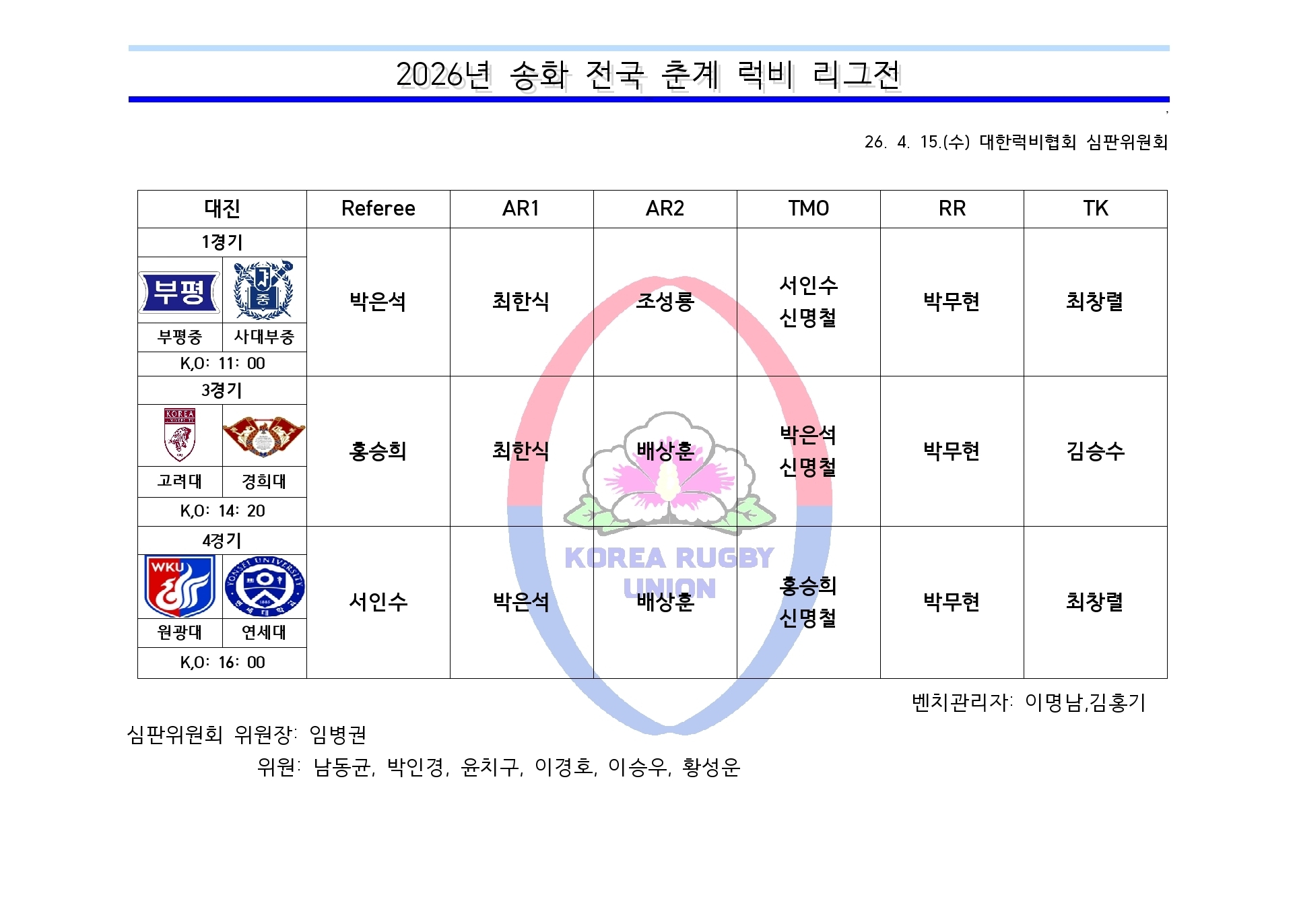 2026년 송화 전국 춘계 럭비 리그전(04.16) 심판 배정