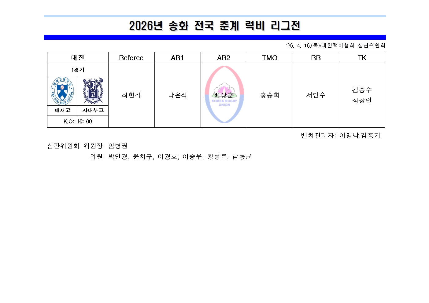 2026년 송화 전국 춘계 럭비 리그전(04.17) 심판 배정