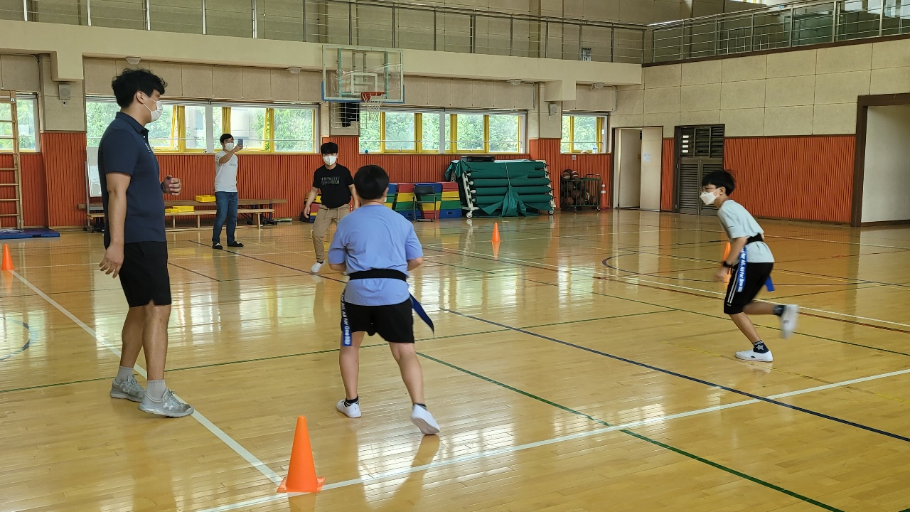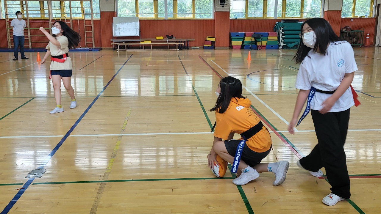 차시가 거듭되면서 럭비 미경험자가 가장 어려워하는 옆 또는 뒤로 패스하기도 능숙하게 할 수 있게 되었습니다.