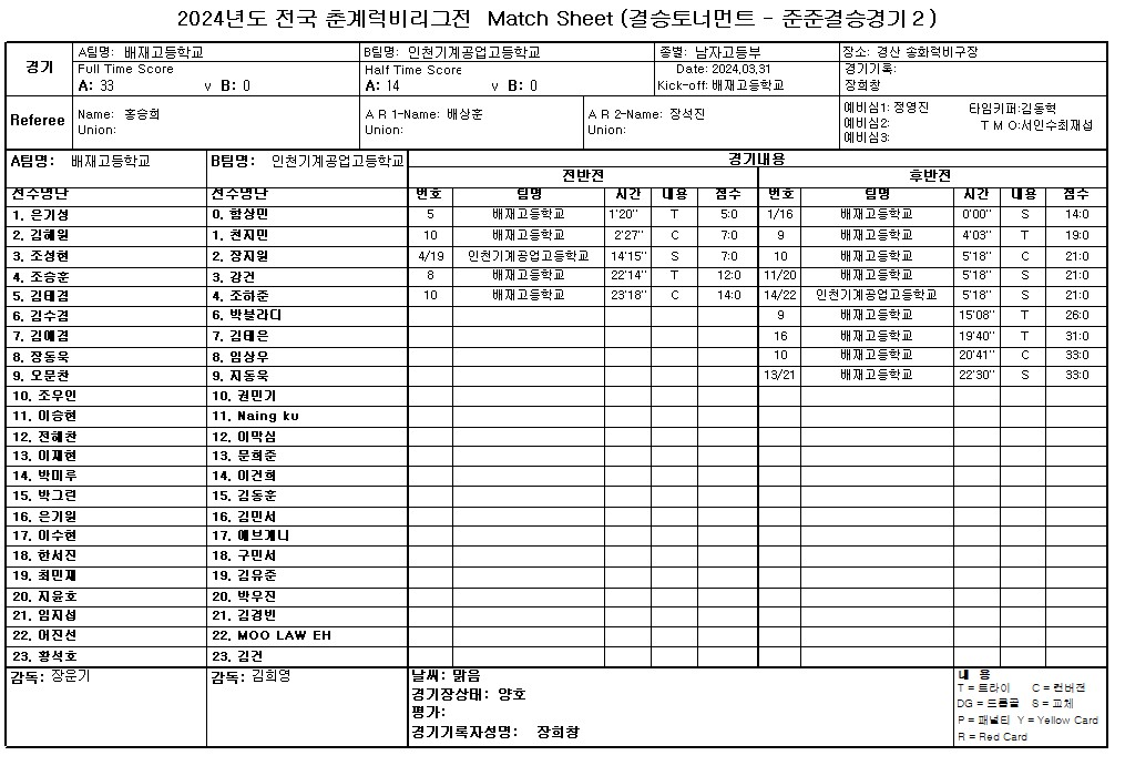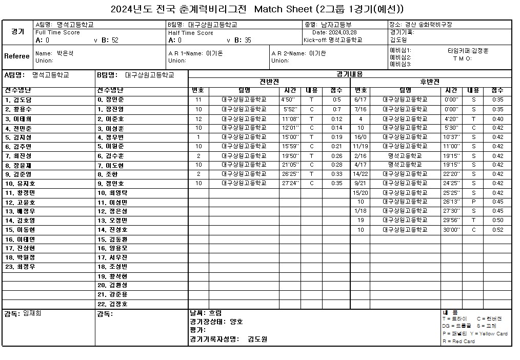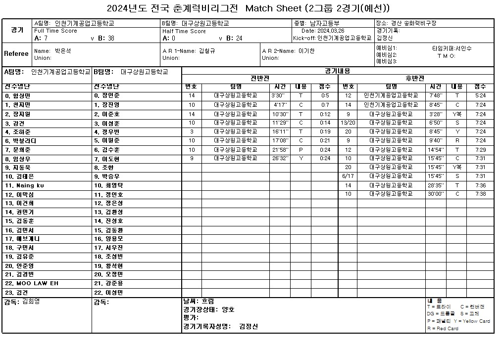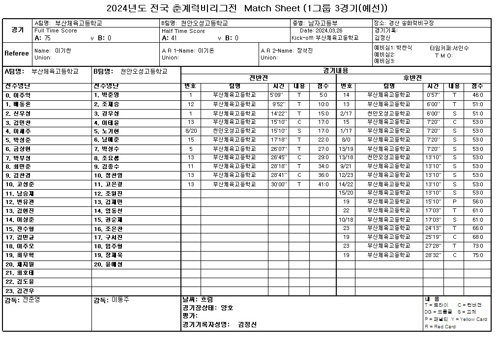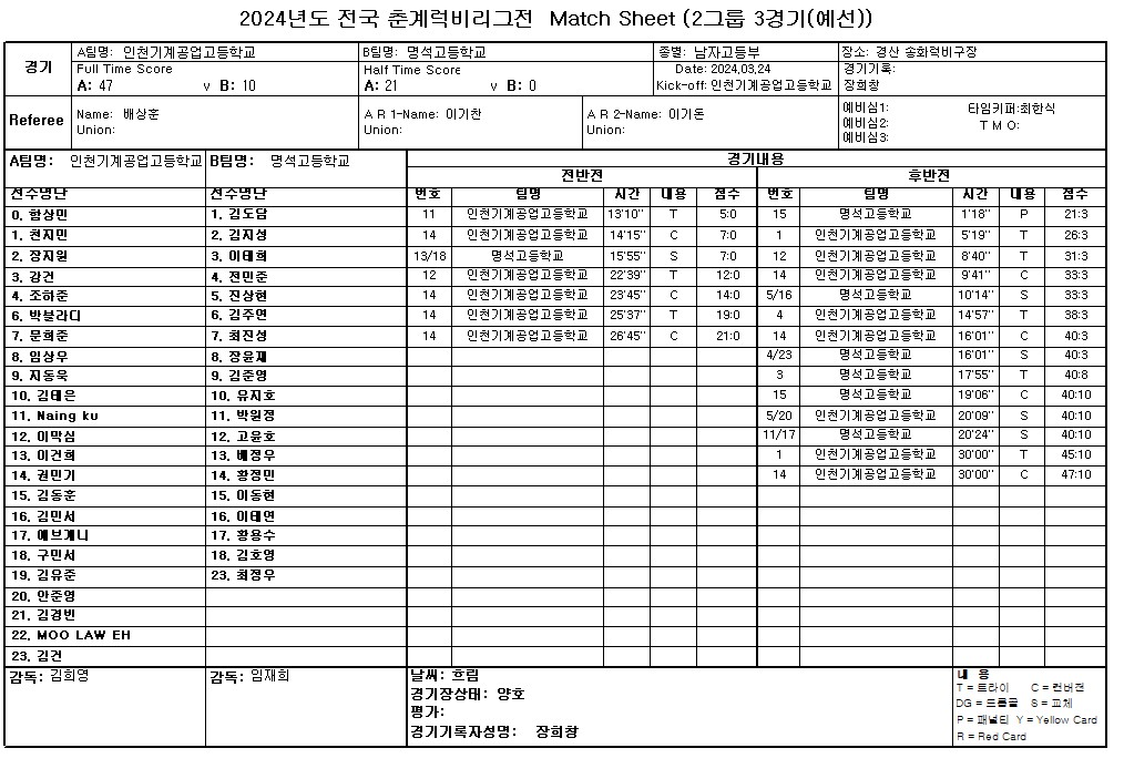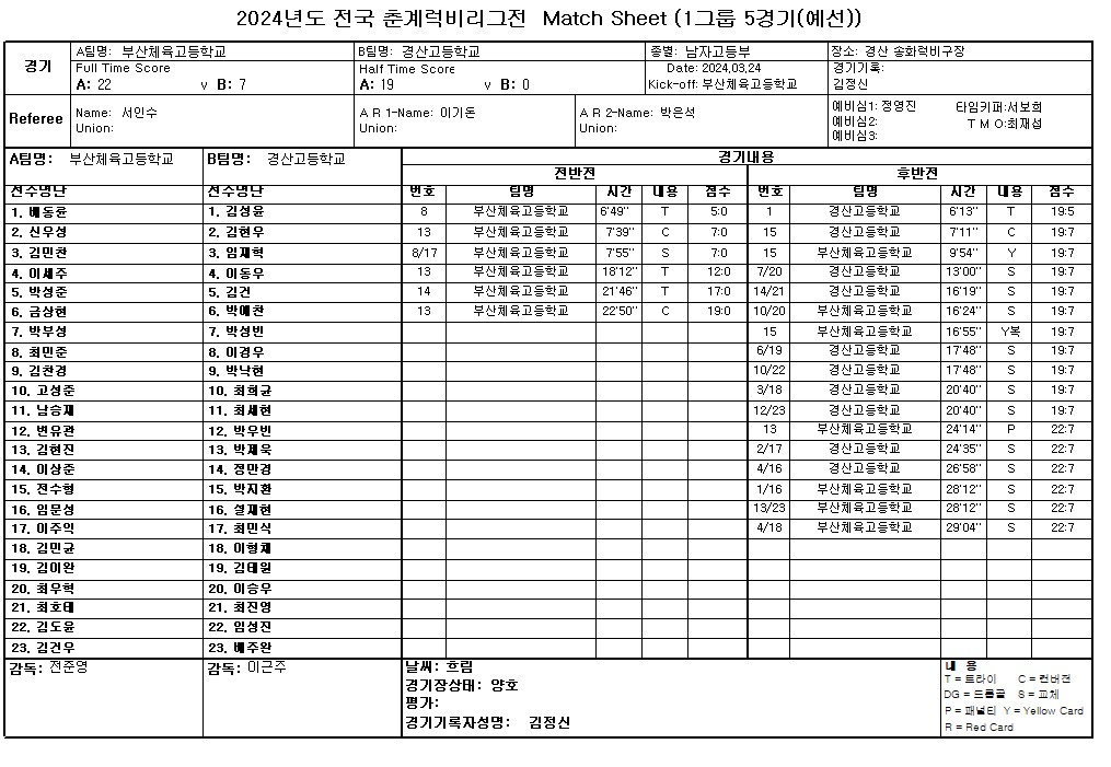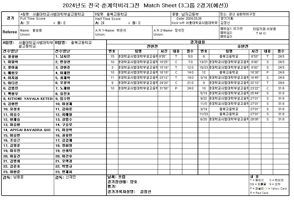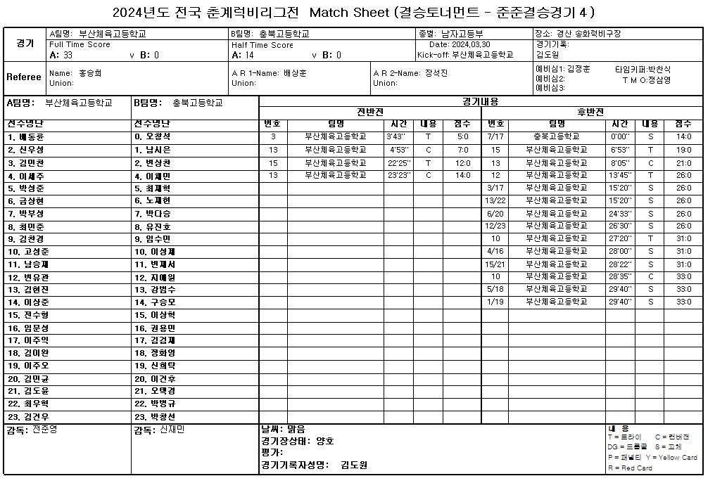 | 2024.03.30 15:30 | 부산체육고등학교 33 VS 0 충북고등학교 |