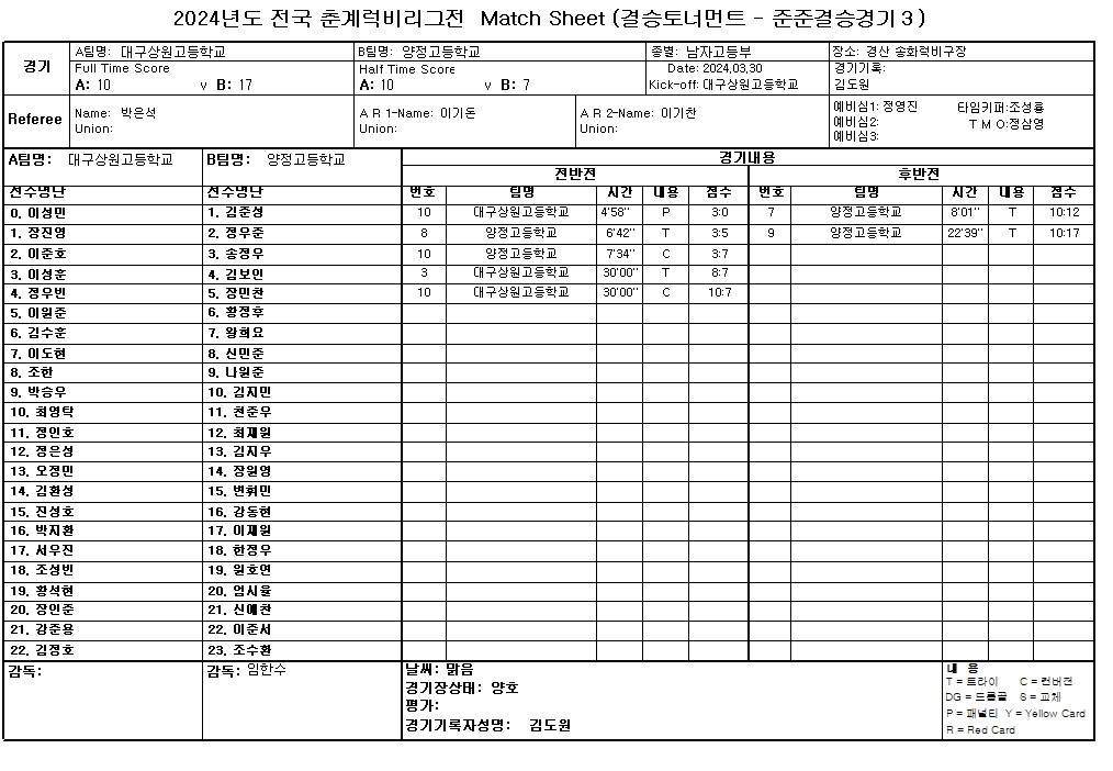 | 2024.03.30 14:00 | 대구상원고등학교 10 VS 17 양정고등학교 |