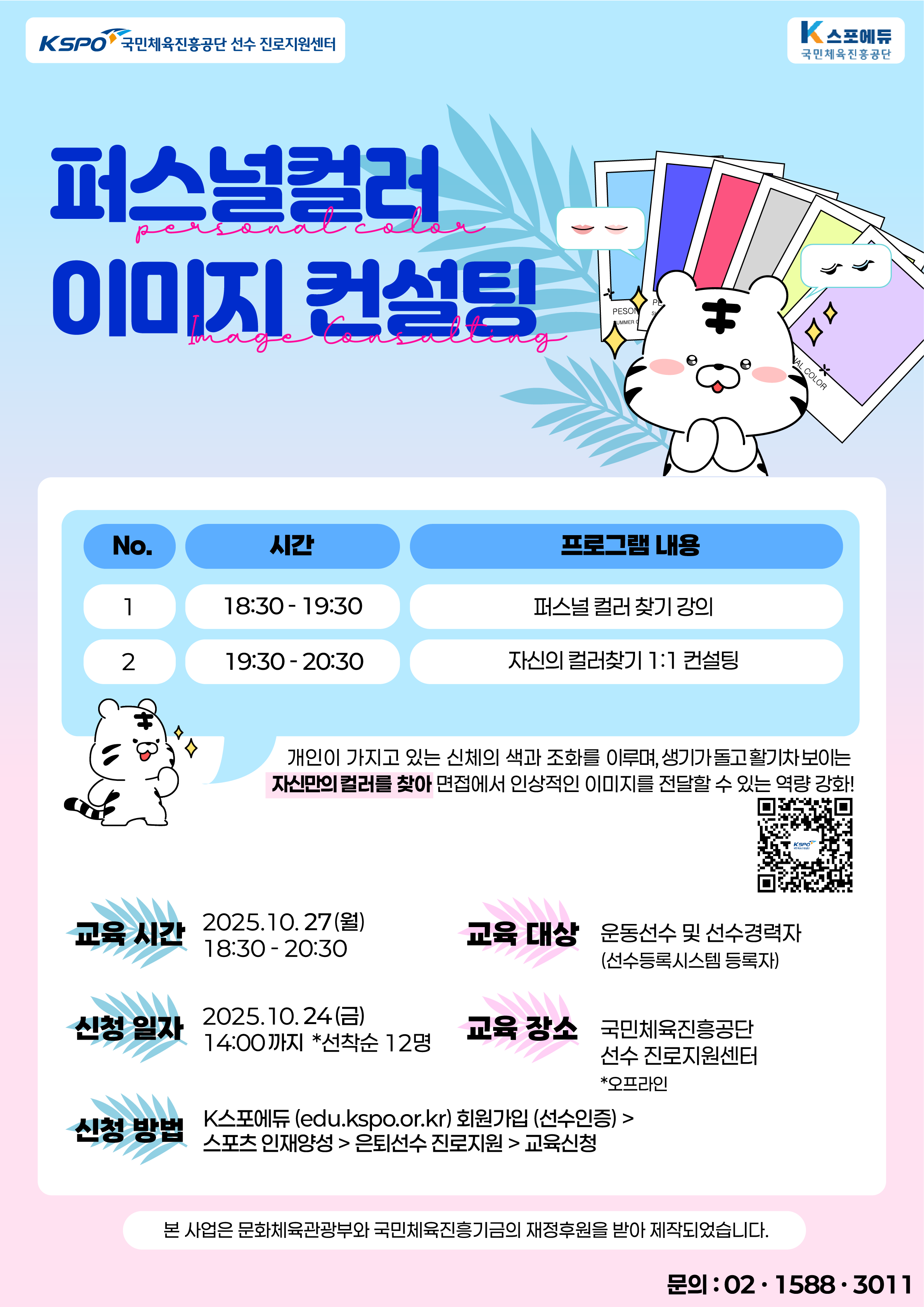 2025.10.01국민체육진흥공단에서 운영하는 ‘2025년 10월 진로역량교육’을 다음과 같이 안내드리오니 많은 참여 바랍니다.