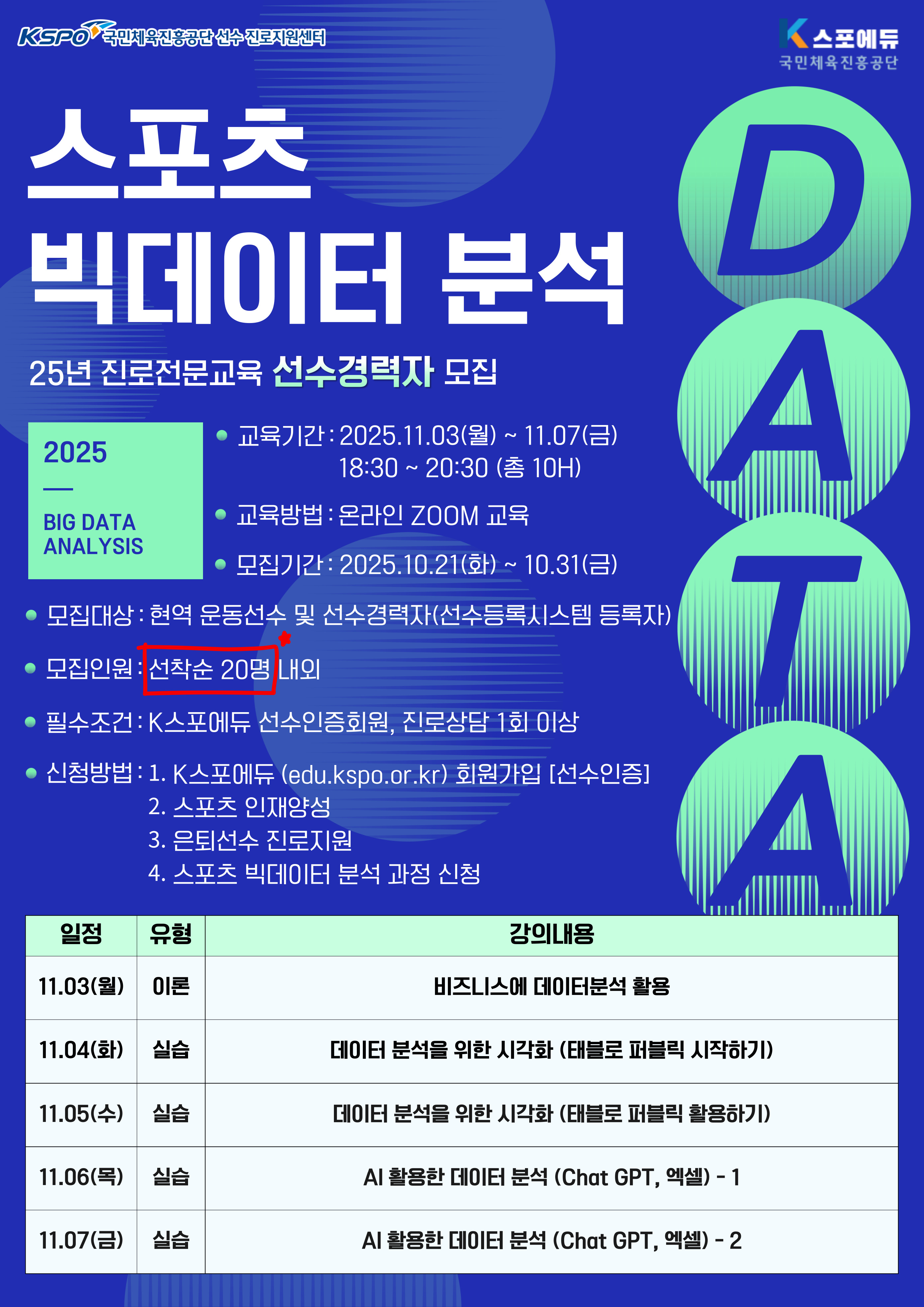 2025.11.04국민체육진흥공단에서는 선수경력자(현역 및 은퇴)들의 진로지원을 위하여 다양한 교육과정을 운영하고 있습니다. 관련하여 선수경력자를 대상으로 「2025년 11월 진로역량교육」을 아래와 같이 운영하고자 하오니 많은 참여 바랍니다.