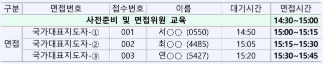 - 대기장소에서 면접번호 순서에 따라 면접 장소로 이동하여 면접 진행