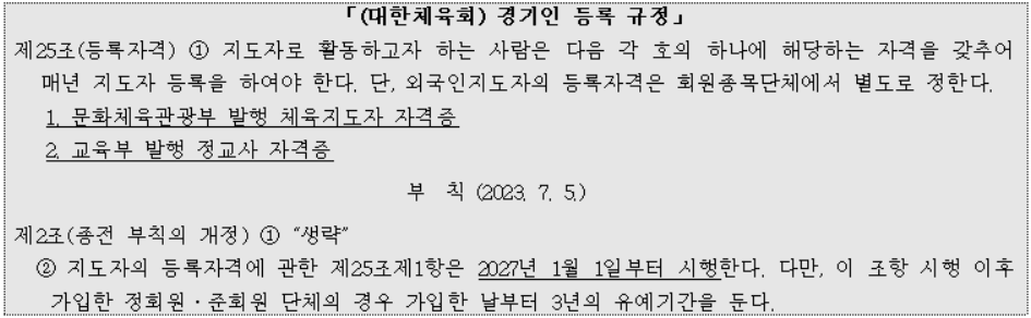 3. 위 규정은 2027년 1월 1일부터 시행되는 바, 시행 이후에는 해당 자격을 보유하지 않은 경우 지도자 등록이 제한 될 수 있습니다.