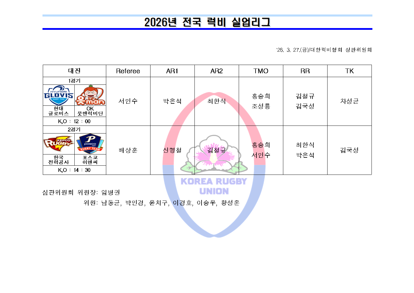 2026 전국 럭비 실업리그(3.28.) 심판 배정