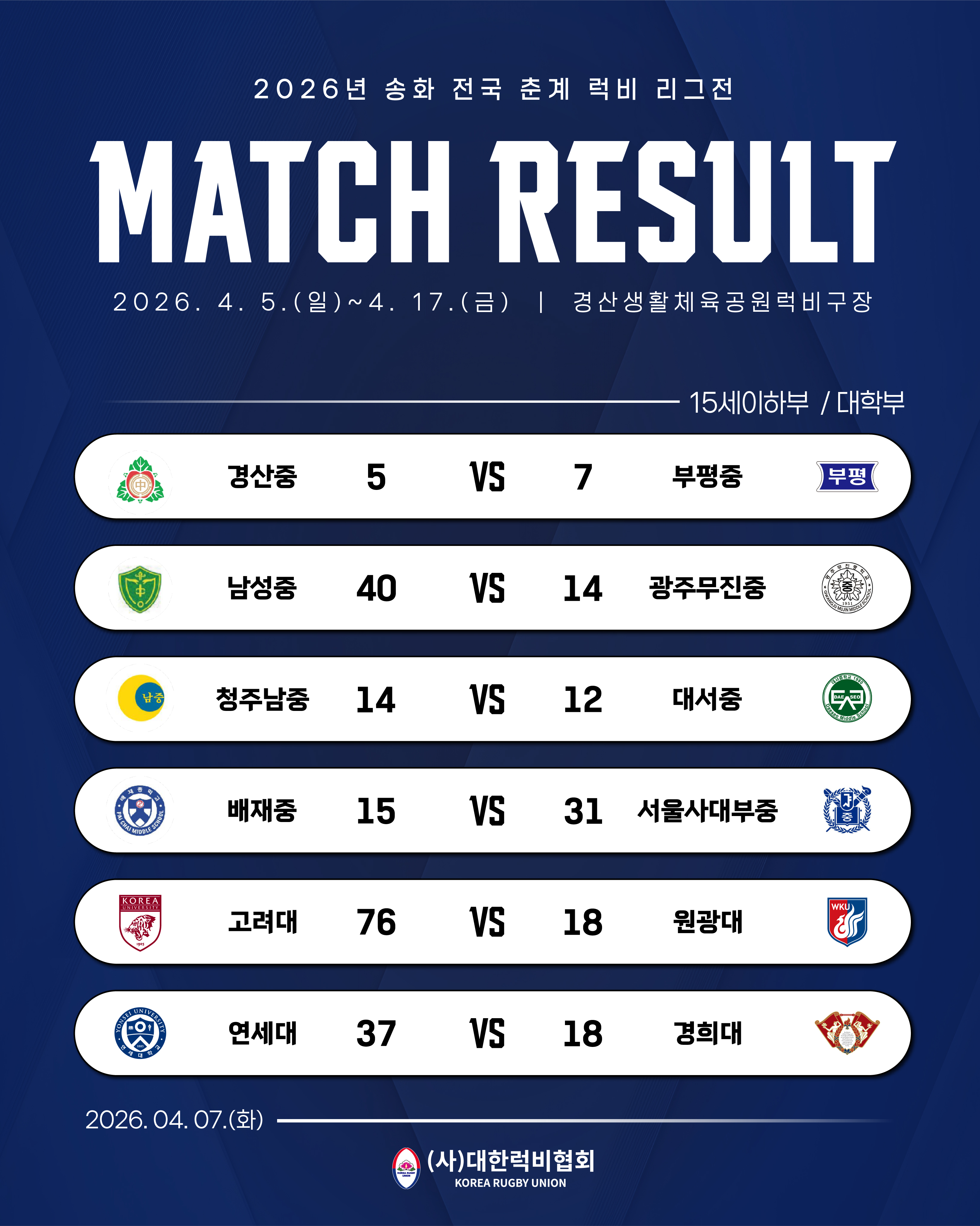 2026년 송화 전국 춘계 럭비 리그전(04.07) 경기결과