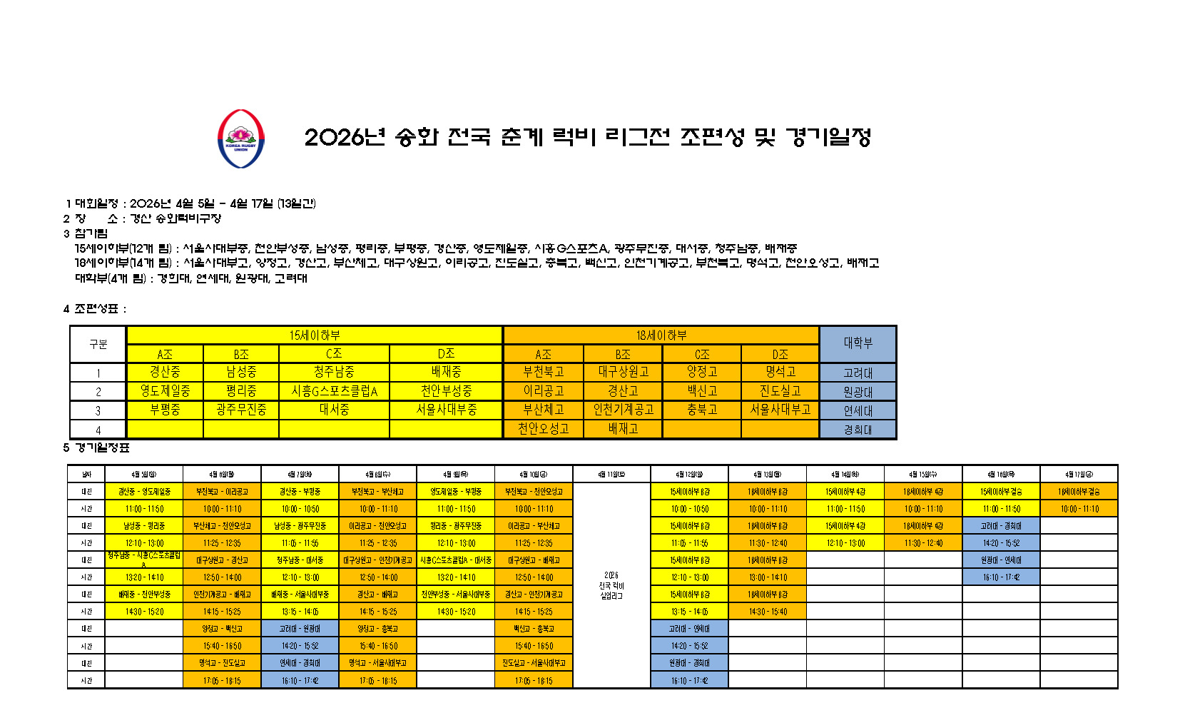 2026 송화 전국 춘계 럭비 리그전 조편성 및 경기일정을 아래와 같이 안내드리오니 참고 바랍니다.