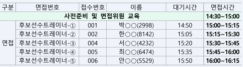 - 대기장소에서 면접번호 순서에 따라 면접 장소로 이동하여 면접 진행