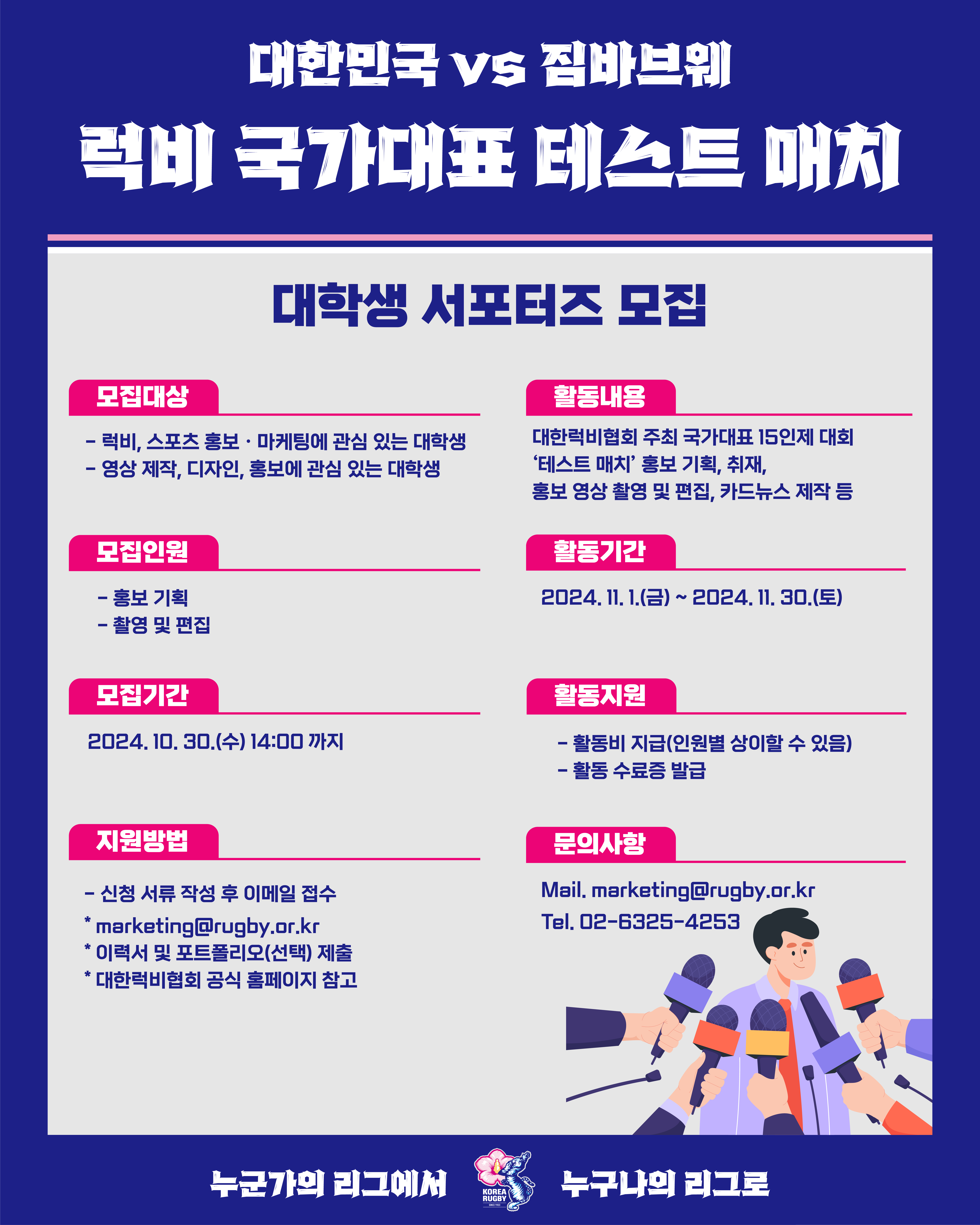 대한럭비협회(회장 최윤)가 ‘대한민국vs짐바브웨 테스트매치 대학생 서포터즈’를 모집 중이라고 29일 밝혔다.