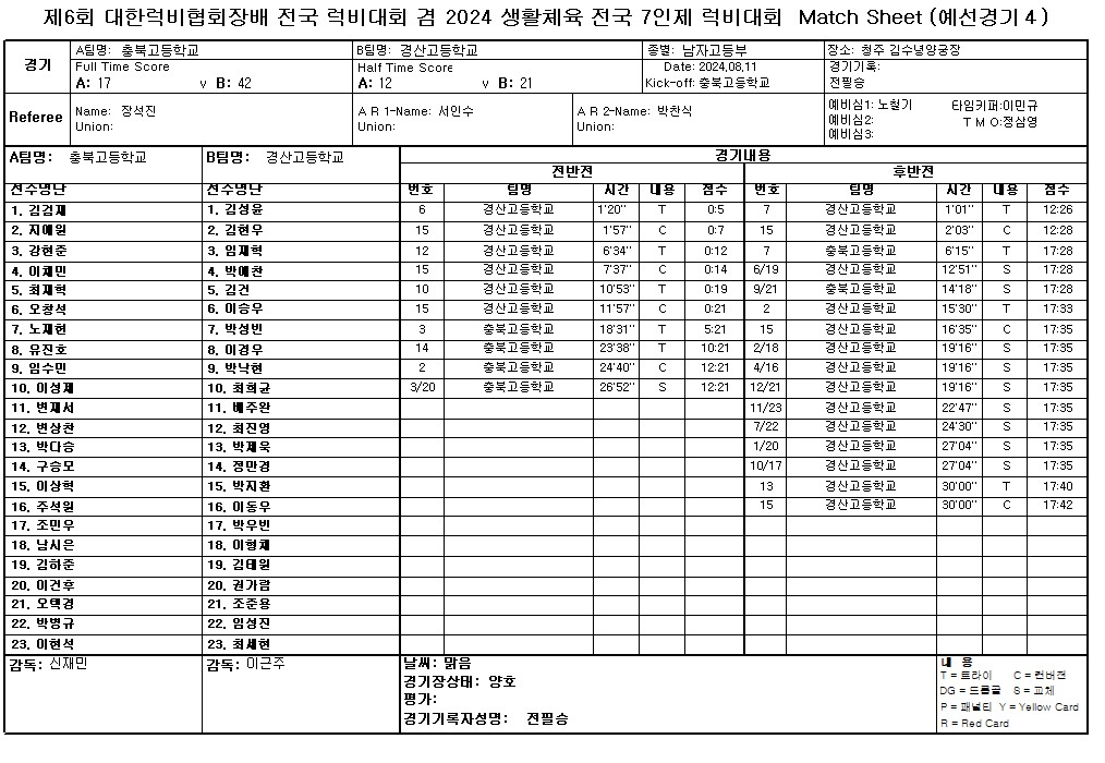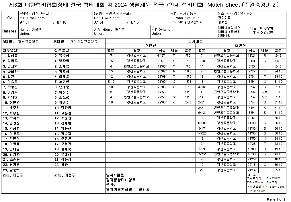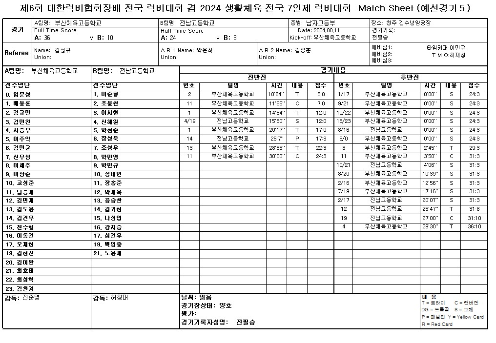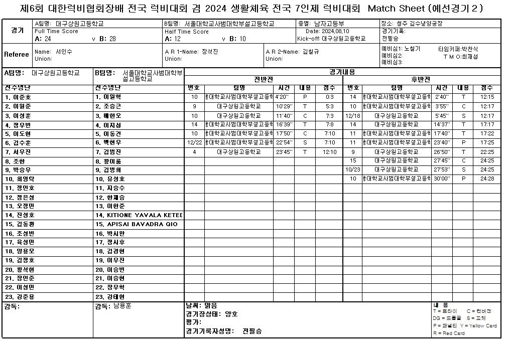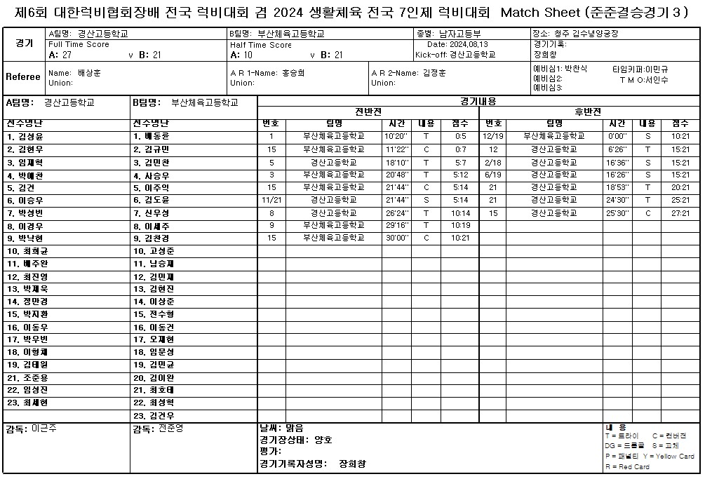 | 2024.08.13 16:20 | 경산고등학교 27 VS 21 부산체육고등학교 |